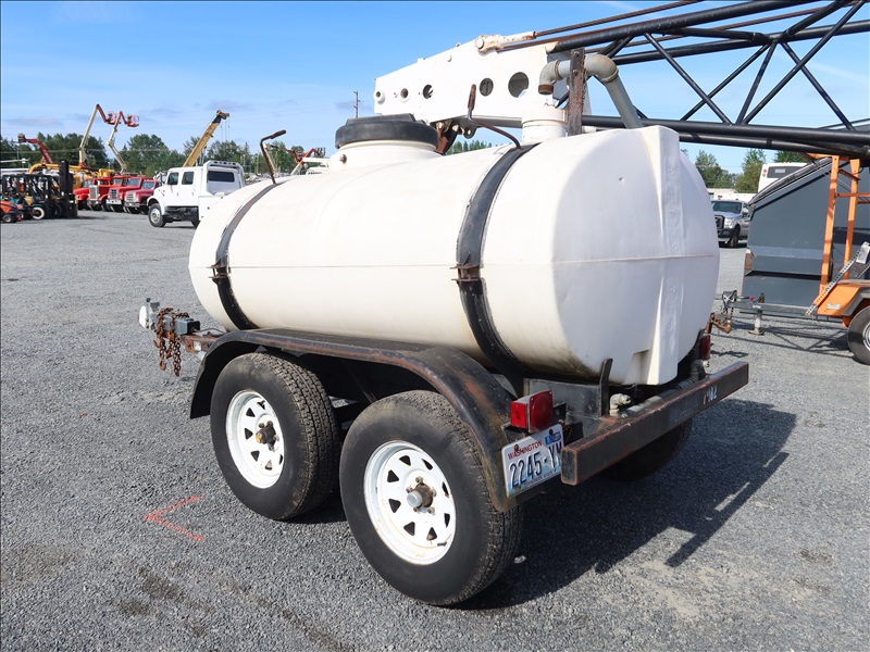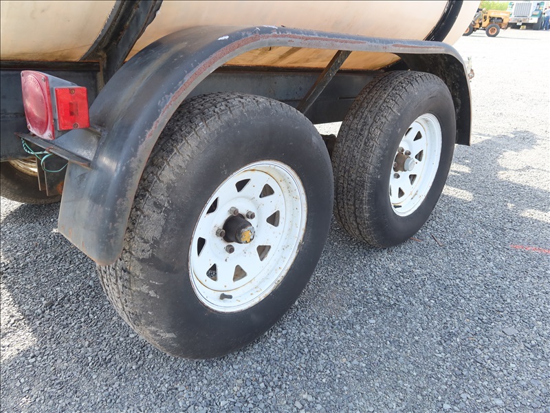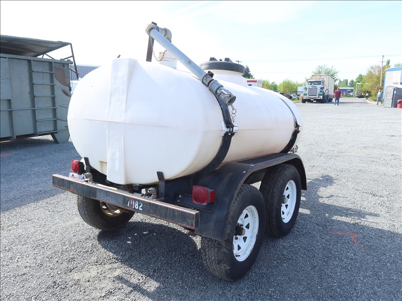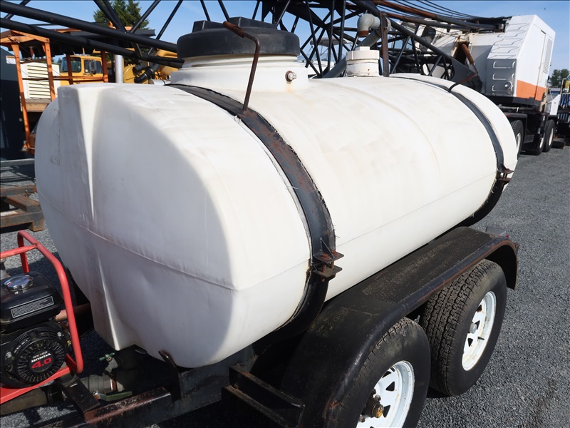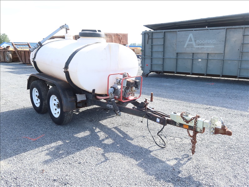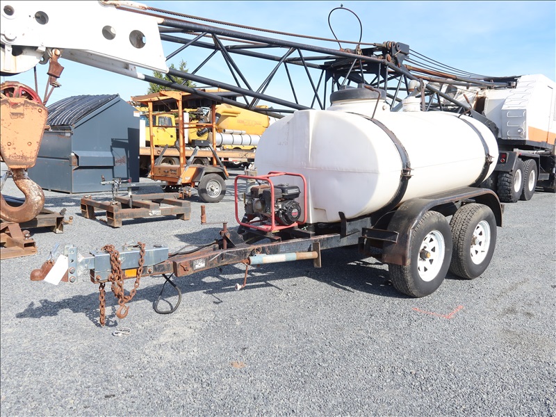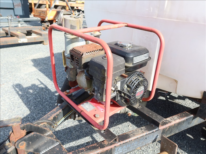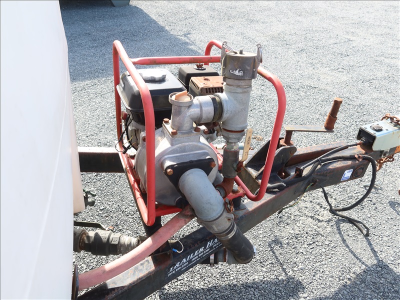 T/A, 500 GAL TRAILER MOUNTED WATER TANK, MULTIQUIP 2" GAS WATER PUMP, SPRAY BAR, SURGE BRAKES, 225/75R15