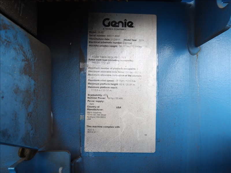 4X4 TELESCOPIC BOOM LIFT, 85' PLATFORM HEIGHT, 500 LB CAPACITY, A/C RECEPTACLE AT PLATFORM, 74 HP DEUTZ D2011L04