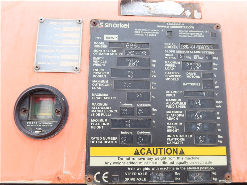 4X4X4 TELESCOPIC BOOM LIFT, 86' PLATFORM HEIGHT, 500 LB CAPACITY, A/C RECEPTACLE AT PLATFORM, 65 HP KUBOTA V2403