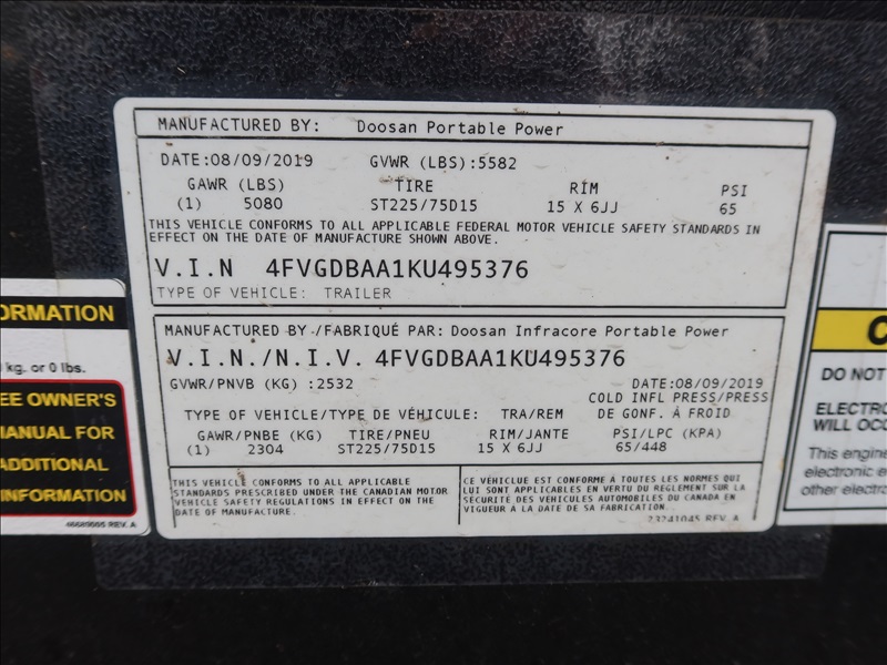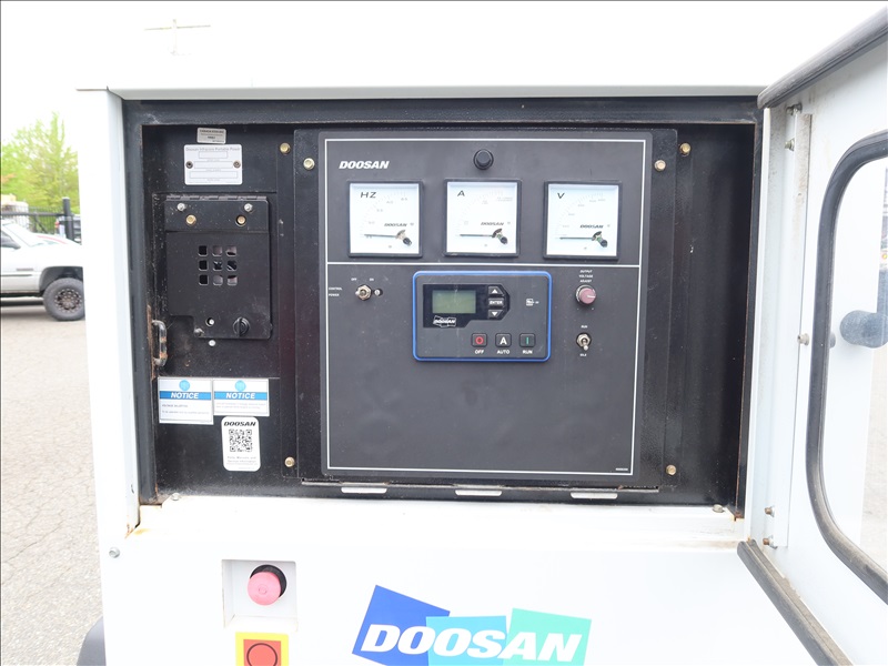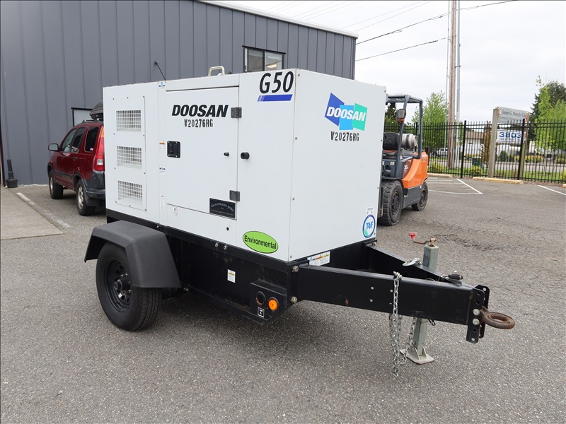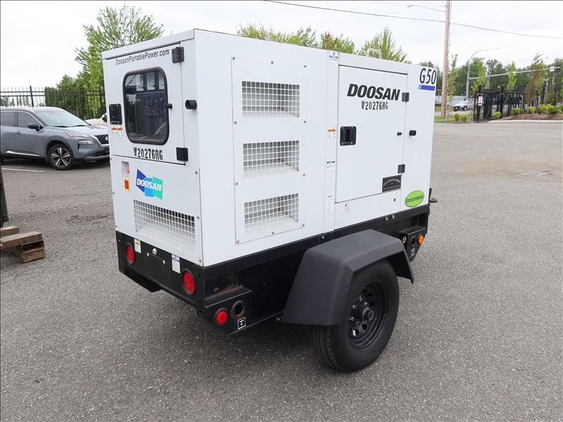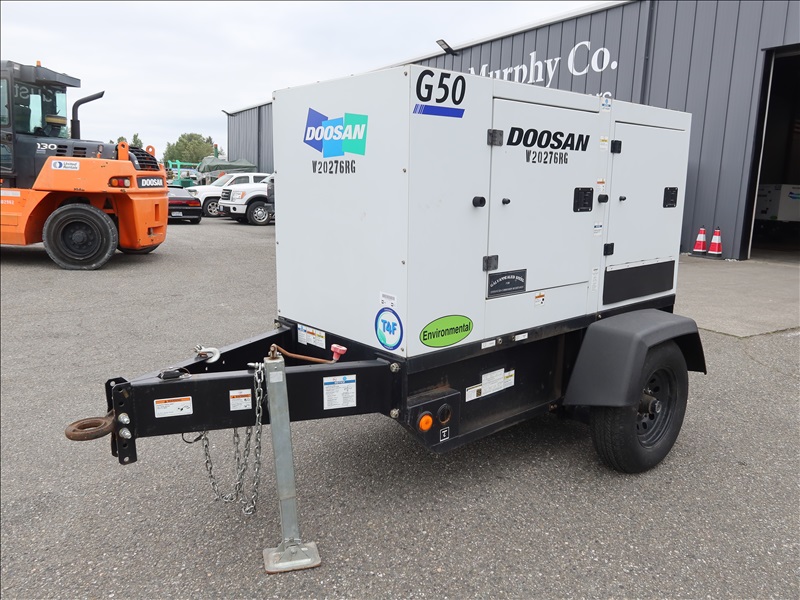 S/A, 48 KVA, TRAILER MOUNTED GENERATOR, DOOSAN 4 CYL DIESEL, 120/208/240/480V, SINGLE OR 3 PHASE, ELECT BRAKES, HOUR METER READS: 4,504