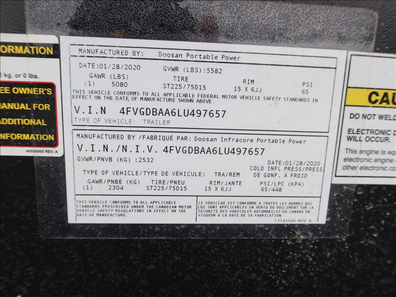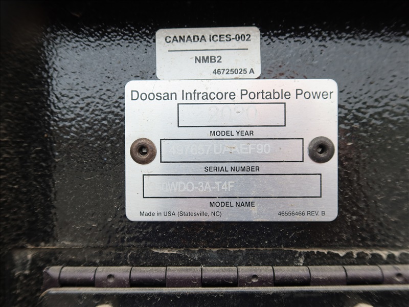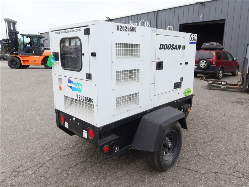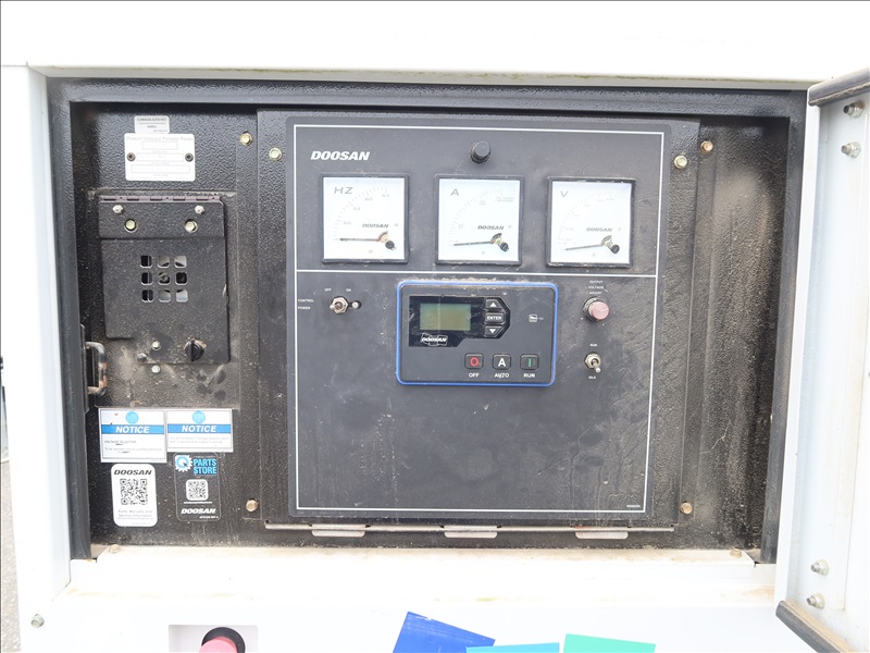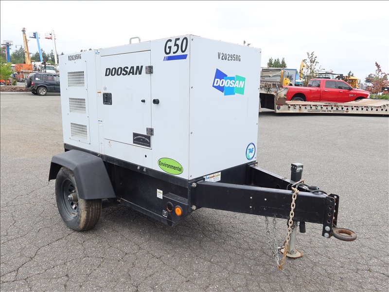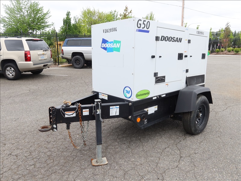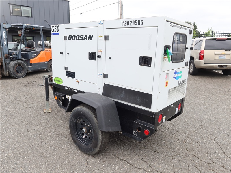 S/A, 48 KVA TRAILER MOUNTED GENERATOR, DOOSAN 4 CYL DIESEL, 120/208/240/480V, SINGLE OR 3 PHASE, ELECT BRAKES, HOUR METER READS: 4,286