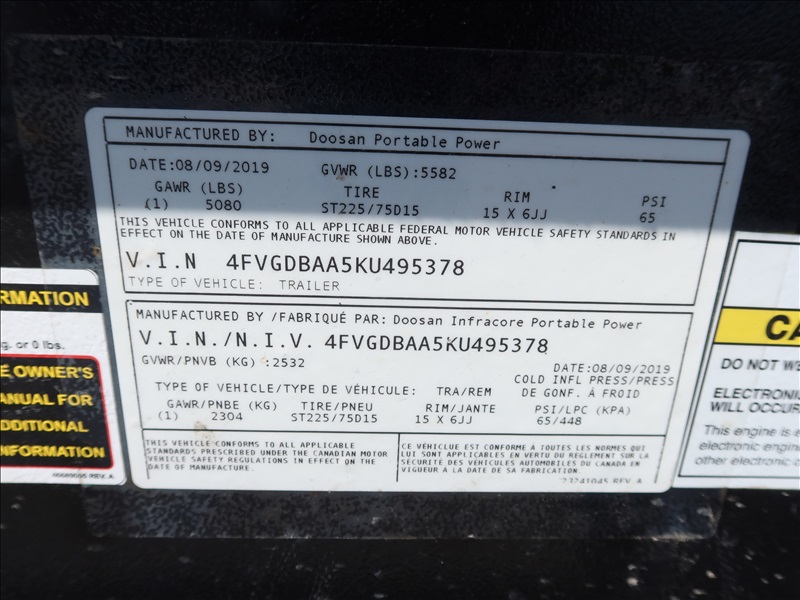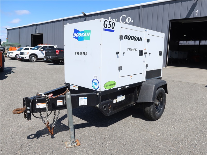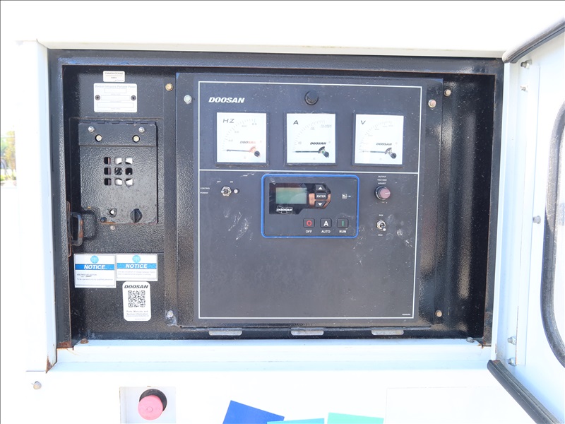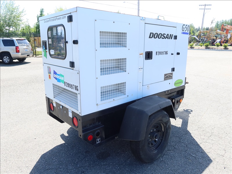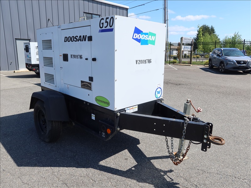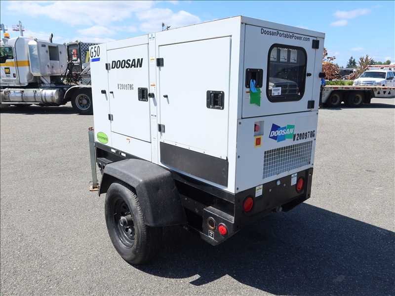 S/A, 48 KVA, TRAILER MOUNTED GENERATOR, DOOSAN 4 CYL DIESEL, 120/208/240V, SINGLE OR 3 PHASE, ELECT BRAKES, HOUR METER READS: 4,975