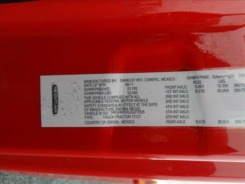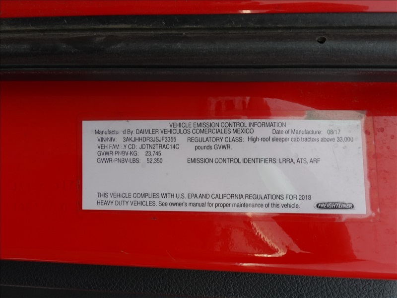 T/A, SLEEPER, TRACTOR, 505 HP DETROIT DD15 AUTO, AIR SUSPENSION, 230" W/B, 12,350 LB FRONT, 40,000 LB REARS, SLIDER, A/B (CEL, ABS TRACTION CONTROL LIGHT IS ON)