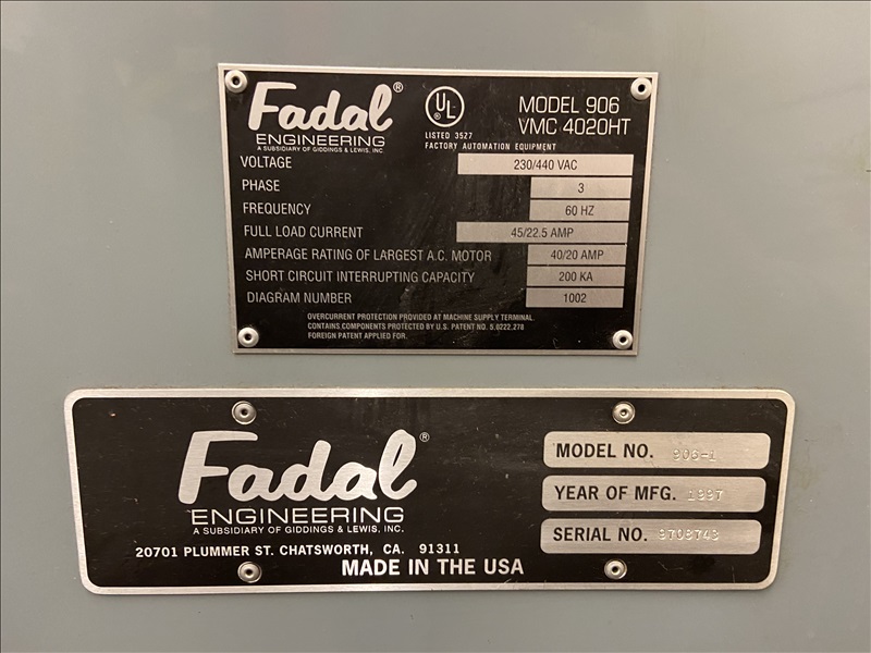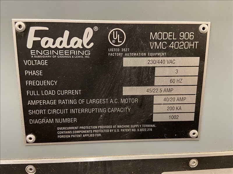 4-AXIS CNC VERTICAL MILLING CENTER W/10000 RPM, TAPER CAT-40, 30 ATC, 20"X48" T-SLOT TABLE, FADAL CNC88HS CONTROLS; 15 HP, 220/440V, 3-PH