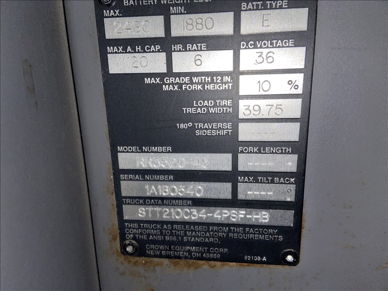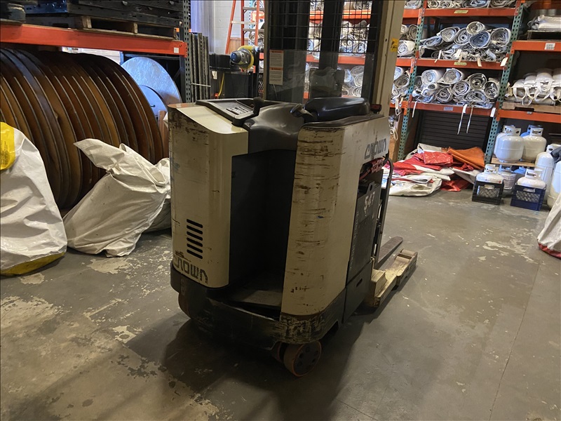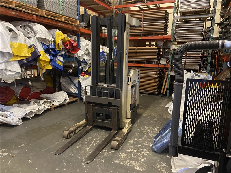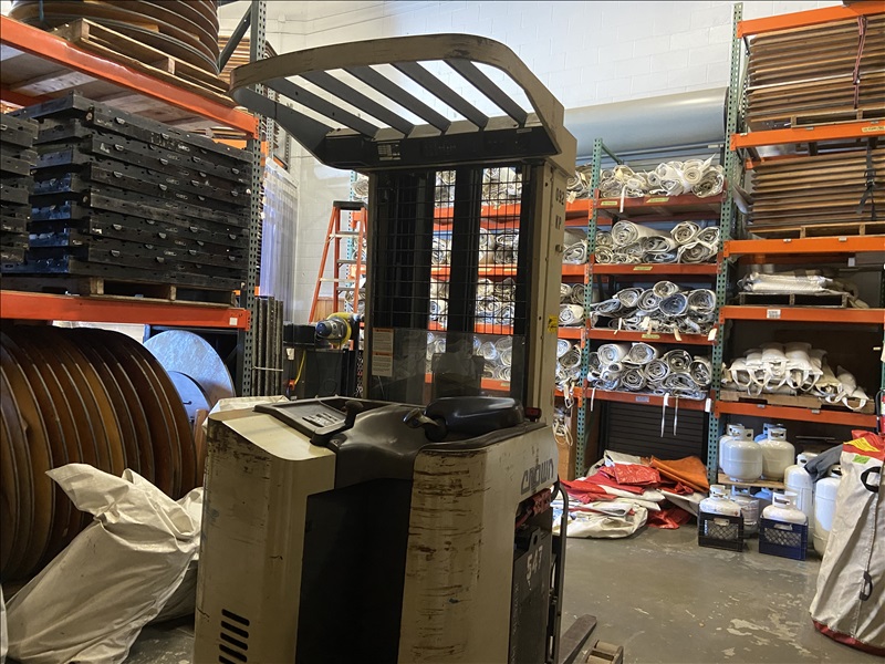 4,500 LB STANDUP NARROW-AISLE ELECTRIC SINGLE-REACH FORKLIFT W/20' REACH TRIPLEX MAST, SIDESHIFT, MRG EAGLE SMART 120V INPUT/36V OUTPUT PORTABLE CHARGER (BATTERY RECENTLY RECONDITIONED)