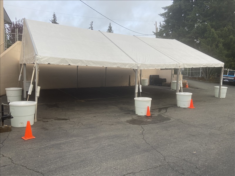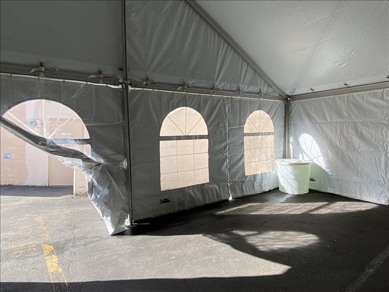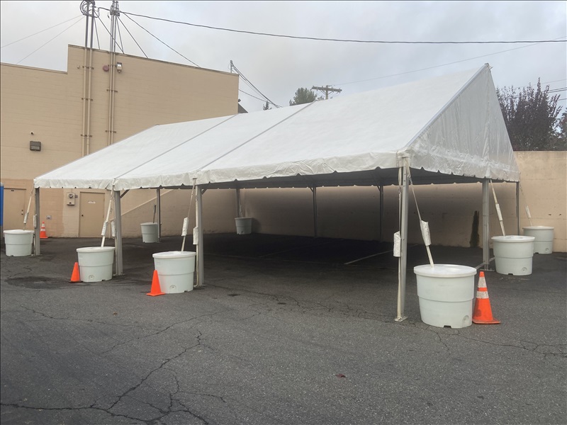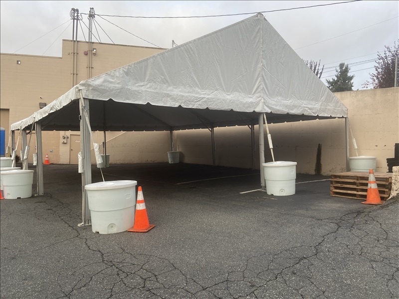 30'X40' KEDER GABLE (SLIDE IN TOP) VINYL TENT W/ROLLER WALL & JEFFY TENT WEIGHT POLY BARRELS (SETUP FOR DISPLAY AT PREVIEW)