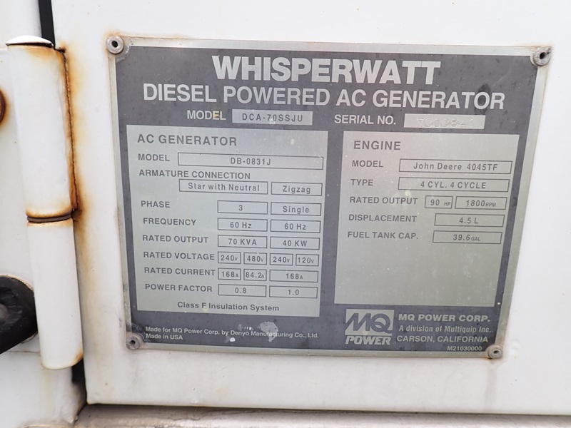 70KVA - 40KW PORTABLE GENERATOR, JOHN DEERE 4045TF 90HP DIESEL