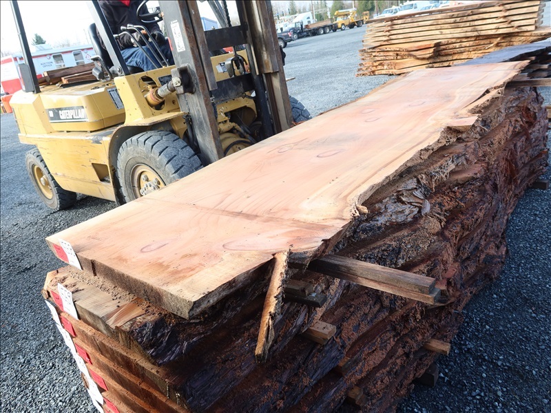 2-1/2" X 124" 2-YEAR AIR DRY LIVE EDGE REDWOOD SLAB (LARGE END 32", SMALL END 29", MEASUREMENTS ARE APPROX)