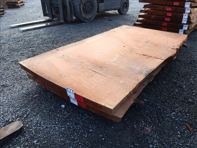 2-1/2" X 89" 2-YEAR AIR DRY LIVE EDGE REDWOOD SLAB (LARGE END 47", SMALL END 46", MEASUREMENTS ARE APPROX)
