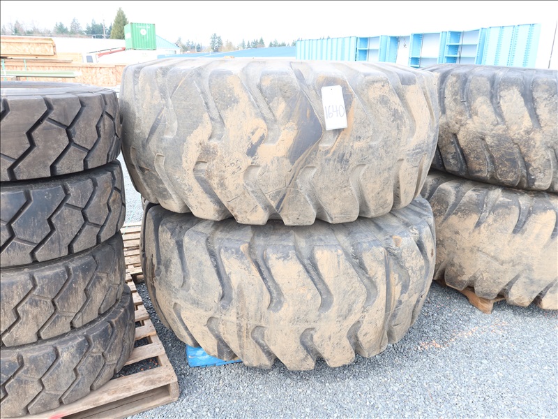PAIR OF BRIDGESTONE R-LUG 26.5-25 20-PLY TUBELESS MOUNTED EQUIPMENT TIRES