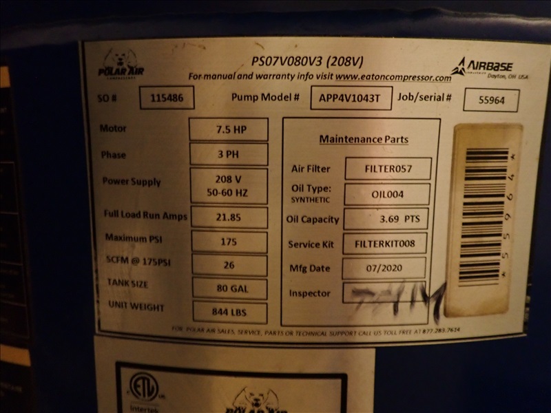 7.5 HP, 2-STAGE 80 GALLON VERTICAL TANK AIR COMPRESSOR W/AIR DRYER & WHISPER 100 SILENCER