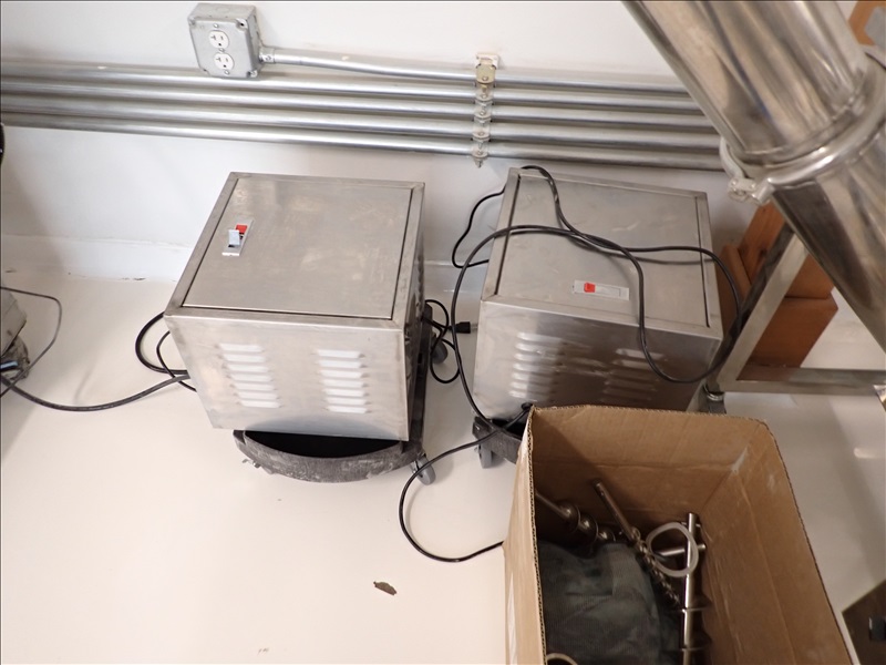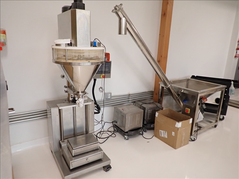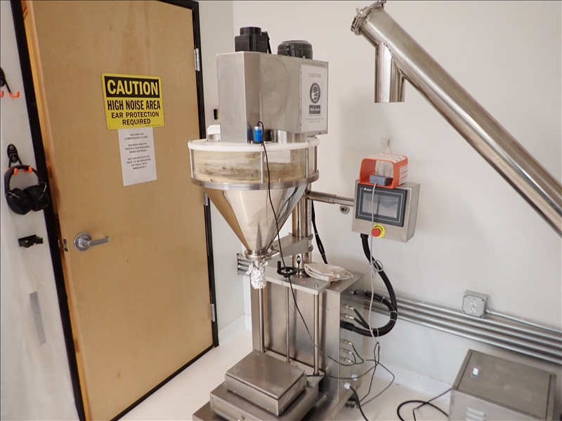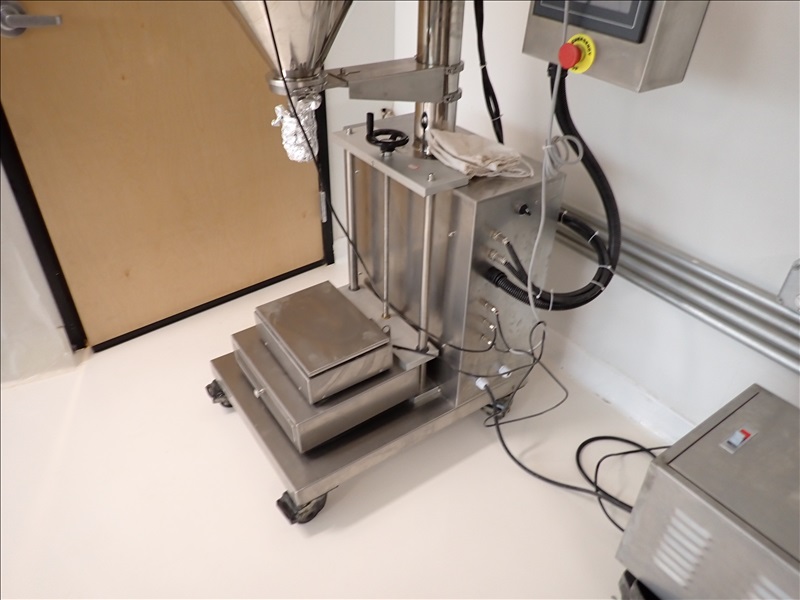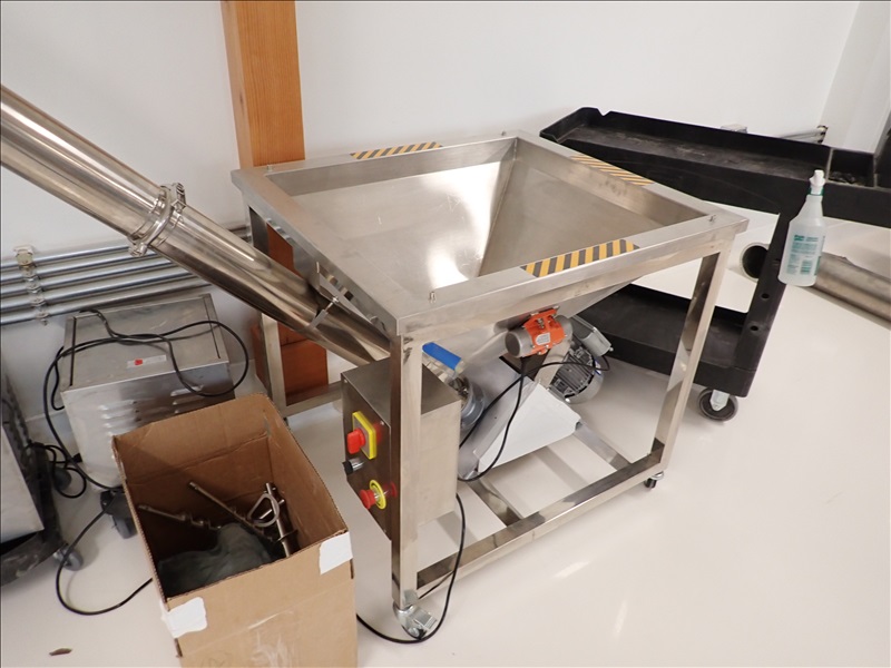 DOSING/FILLING STATION, 27"X30" S/S HOPPER, SCREW AUGER, TRANSFER CONVEYOR, SCALE, (2) TRANSFORMERS, DELTA TOUCH SCREEN CONTROLS, FOOT CONTROL