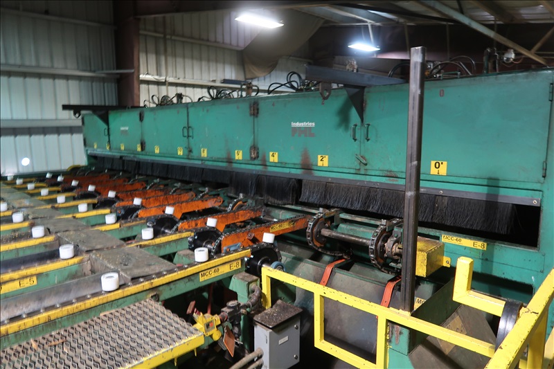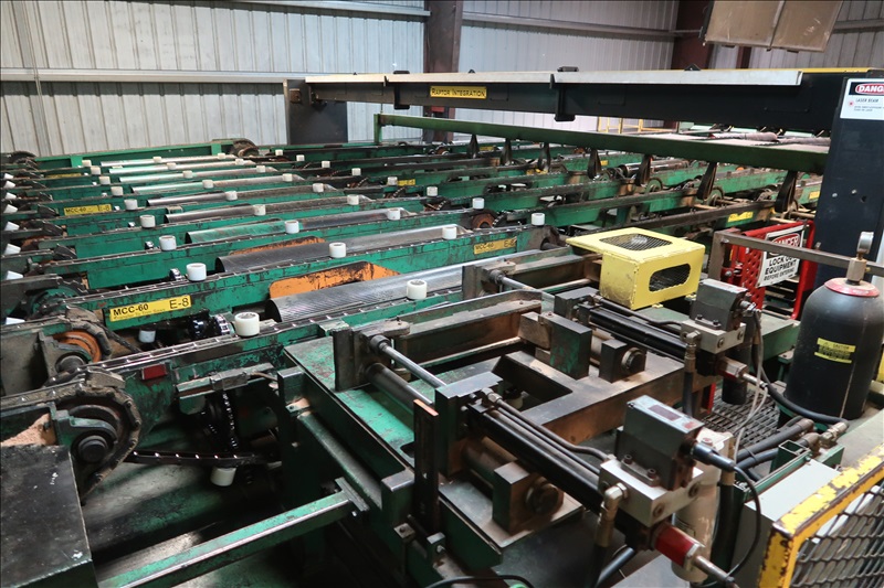 20' LH SAWMILL TRIMMER W/2-STAGE FENCE, (11) 18" INDIVIDUALLY MOTORIZED SAWS W/ZERO SAW, APPROX. 9' 11-STRAND 81X LUGGED FEEL THRU TRANSFER, 4' 8-ARM SMART TIPPLE, 25' 9-STRAND 81X LUGGED OUTFEED TRANSFER W/(9) 15' EVEN END ROLLS, 10 HP HYDRAULIC UNIT, CONTROLS, ELECTRICS, SPARE PARTS & SAWS