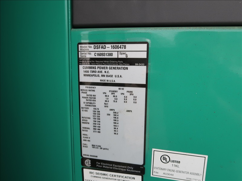 DIESEL GENERATOR, MAX FLOW 133L/HR, POWER COMMAND DIGITAL DISPLAY, 60 KW, 60 HZ