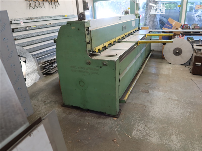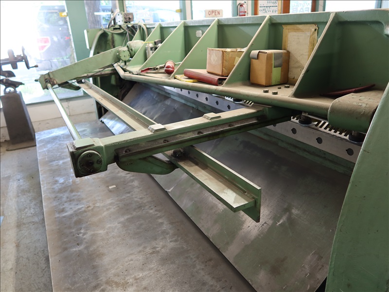 14 GA X 10' POWER SQUARING SHEAR W/REAR OPERATED MANUAL BACK GAUGE, FOOD PEDAL, ONE SHOT LUBE SYSTEM, AIR CLUTCH & BRAKE, STROKE COUNTER (BUYER WILL NEED TO HIRE A RIGGER TO DISASSEMBLE & HAUL, UNIT IS HARDWIRED & BUYER IS RESPONSIBLE FOR SAFELY & PROPERL
