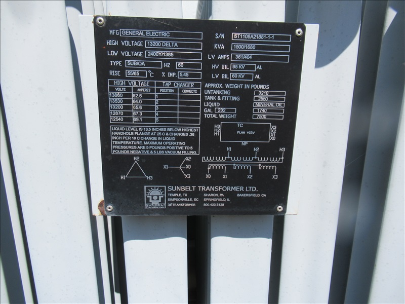 1,500/1,680 KVA PAD MOUNTED TRANSFORMER, HIGH VOLTAGE 13,200V DELTA, LOW VOLTAGE 2,400Y/1,385V