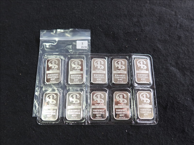 LOT, (10) NORTHWEST TERRITORIAL MINT 1 OZ SILVER BARS (10 OZ .999 SILVER)