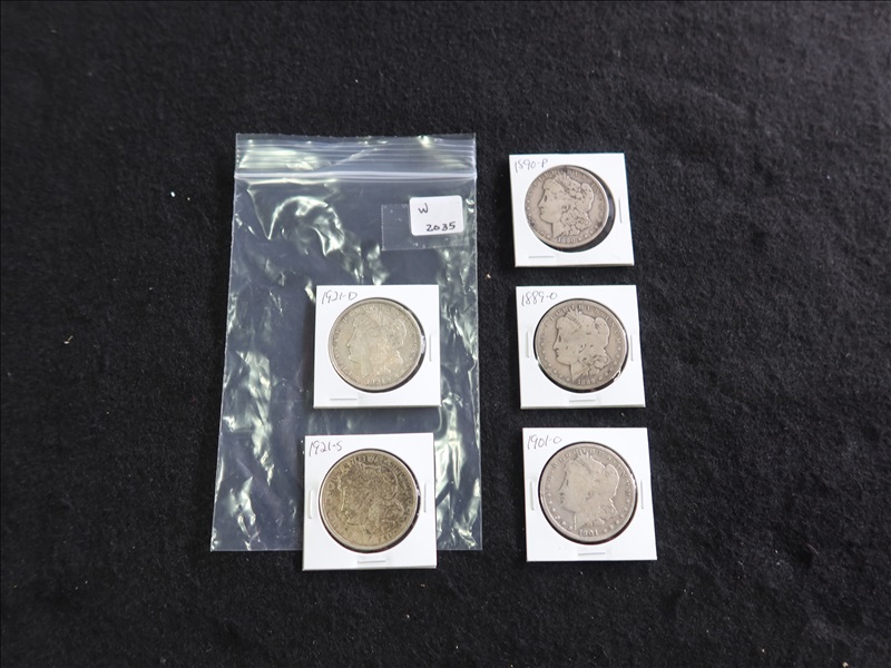 LOT, (5) ASSORTED MORGAN SILVER DOLLARS TO INCLUDE: (1) 1890, (1) 1889O, (1) 1901O, (1) 1912D & (1) 1921S