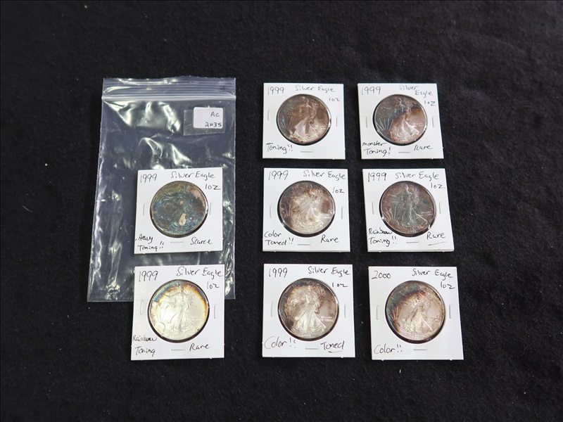 LOT, (8) ASSORTED SILVER EAGLES W/COLOR TONING TO INCLUDE: (7) 1999 & (1) 2000