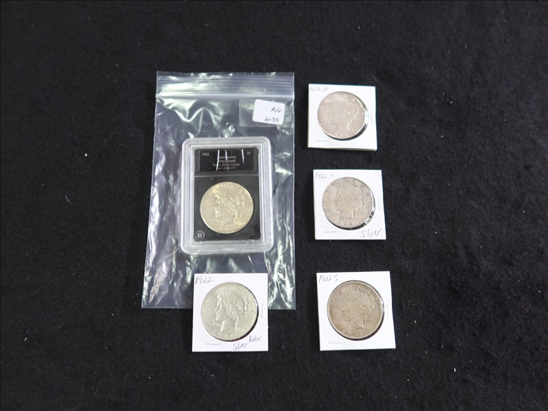 LOT, (5) ASSORTED PEACE SILVER DOLLARS TO INCLUDE: (3) 1922 & (2) 1922S