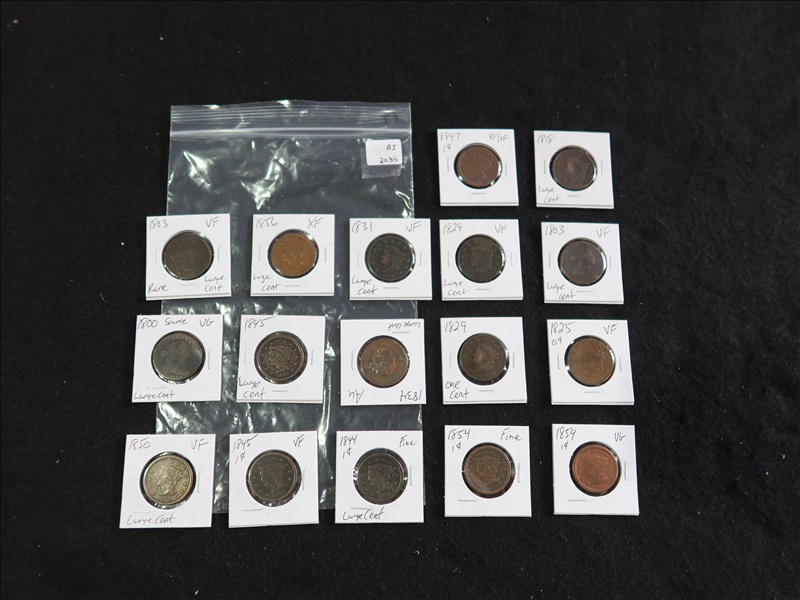 LOT, (17) ASSORTED LARGE CENTS TO INCLUDE: (1) 1800, (2) 1803, (1) 1818, (1) 1825, (2) 1829, (1) 1831, (1) 1834, (1) 1844, (2) 1845, (1) 1847, (1) 1850, (2) 1854 & (1) 1856