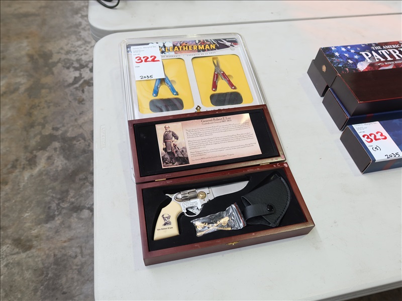 LOT, GENERAL ROBERT E. LEE COLLECTABLE PISTOL SHAPED KNIFE W/WOODEN CASE & LEATHERMAN 2-PIECE MULTI-TOOL SET