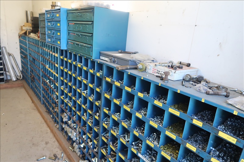 LARGE QUANTITY OF BEARINGS; SPROCKETS; COUPLERS; MILL CHAIN; BUSHINGS; BELTS; NUTS & BOLTS BINS; VALVES; AIR BAGS; PIPE FITTINGS; CYLINDERS; HYDRAULIC MOTORS & PUMPS; MACHINE PARTS; BELTING; SHAFTING; HYDRAULIC HOSE & FITTINGS; (100+) SPARE MOTORS & REDUCERS; ASSORTED ENGINE BLOCKS; STARTERS; ALTERNATORS; GENERATORS; CYLINDERS; FILTERS; HOSES; TIRES; RIMS; HUBS