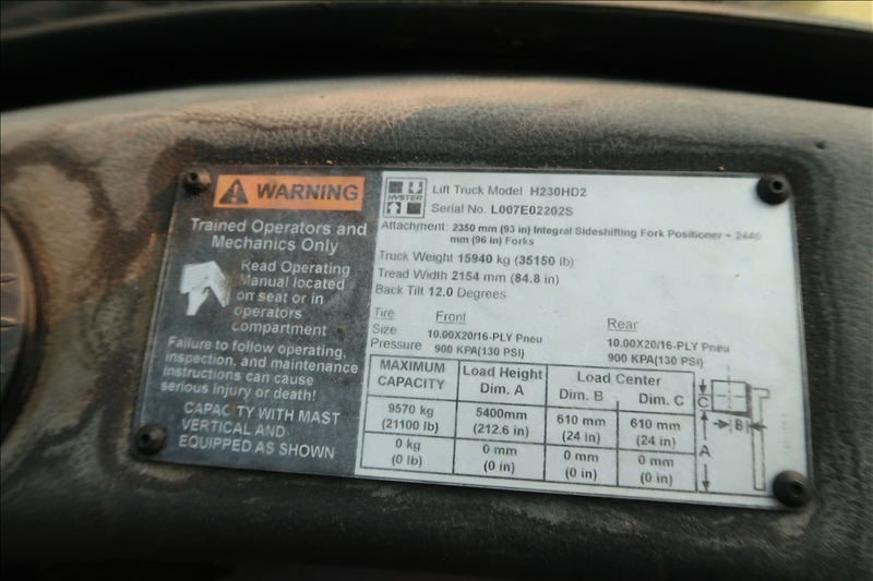 21,100 LB. CAP. DUAL PNEUMATIC TIRE FORKLIFT, CUMMINS QSB 4-1/2 LITER TIER 4 FINAL TURBO DIESEL ENGINE, 212" 2-STAGE MAST, SIDE SHIFT, FORK POSITIONERS, LUMBER FORKS, FINGERTIP CONTROLS