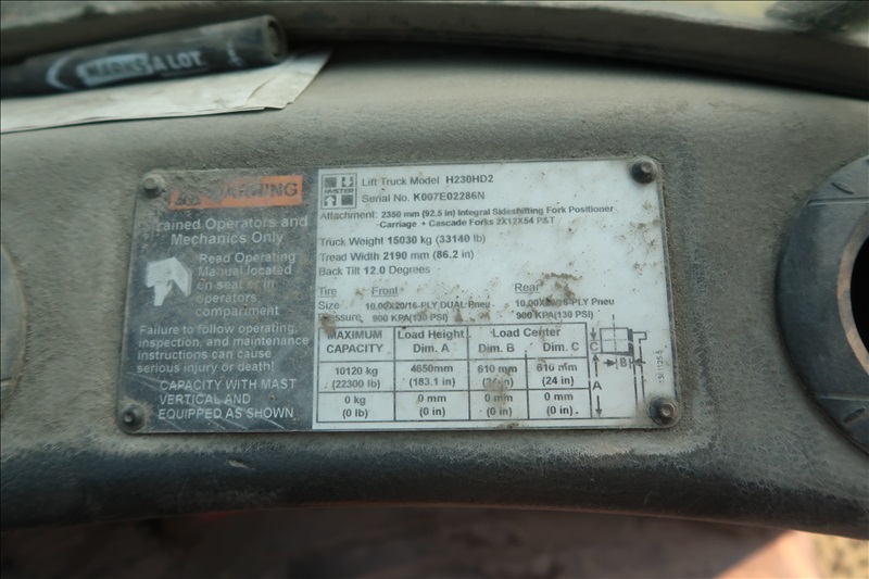 22,300 LB. CAP. DUAL PNEUMATIC TIRE FORKLIFT, CUMMINS QSB 4-1/2 LITER TIER 4 FINAL TURBO DIESEL ENGINE, 183" 2-STAGE MAST, SIDE SHIFT, FORK POSITIONERS, LUMBER FORKS, FINGERTIP CONTROLS, MONOTROL
