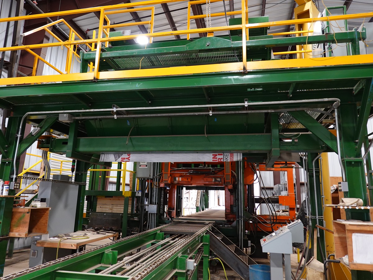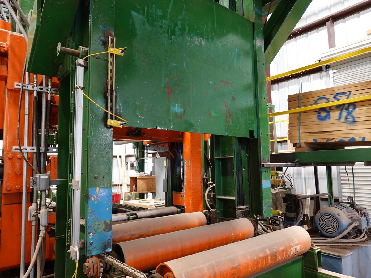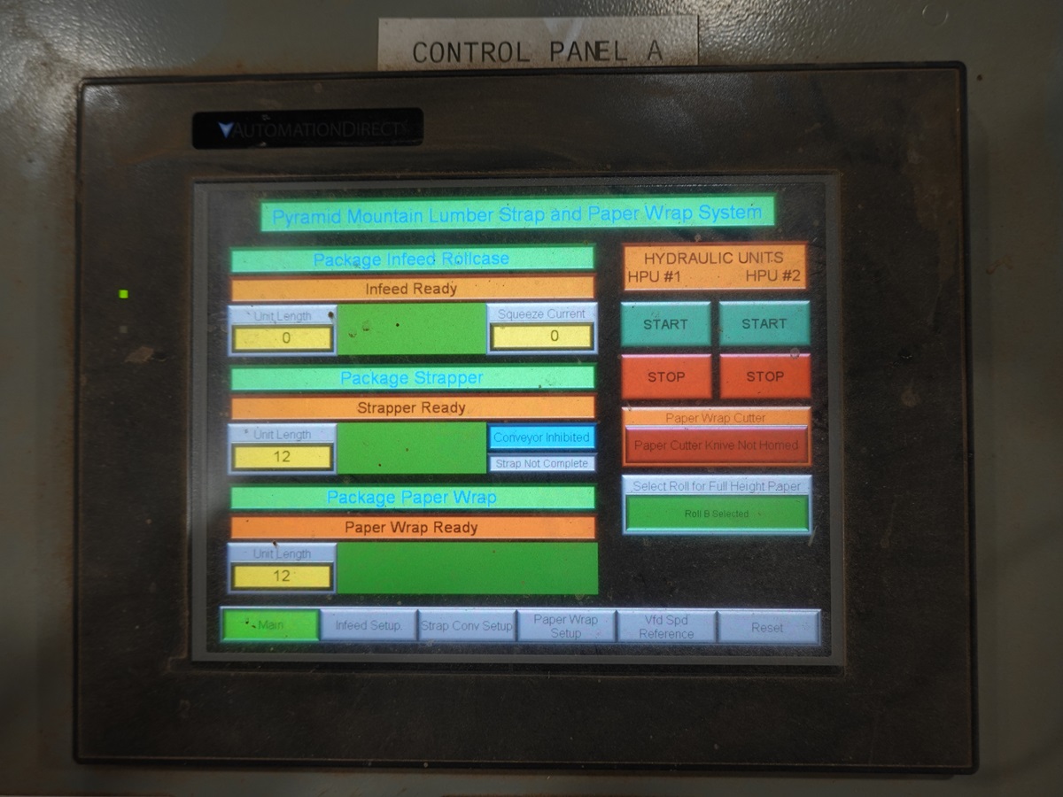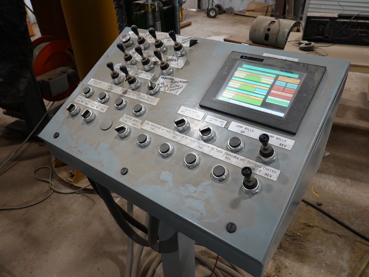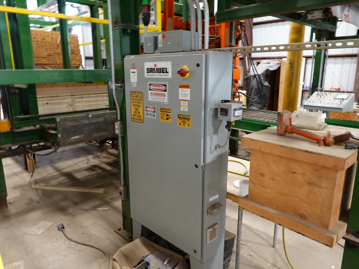 LUMBER STRAP & PAPER WRAP SYSTEM, 30' X 54" INFEED ROLLCASE W/(2) TOSHIBA 5 HP MOTORS, (2) REXNORD DRIVES, 64"W X 54"H BUMP PLATE W/7.5 HP HYDRAULIC SYSTEM, BALDOR 15 HP HYDRAULIC SYSTEM FOR BANDING UNIT, STICKER STACKER, AUTOMATION DIRECT DIGITAL TOUCH SCREEN CONTROLS, OVERHEAD PAPER FEEDER/LOADER WITH CUTTER HEAD, 42' X 38" 2-STRAND OUTFEED, TOSHIBA 10 HP MOTOR W/REXNORD DRIVE, 480V, 3 PHASE