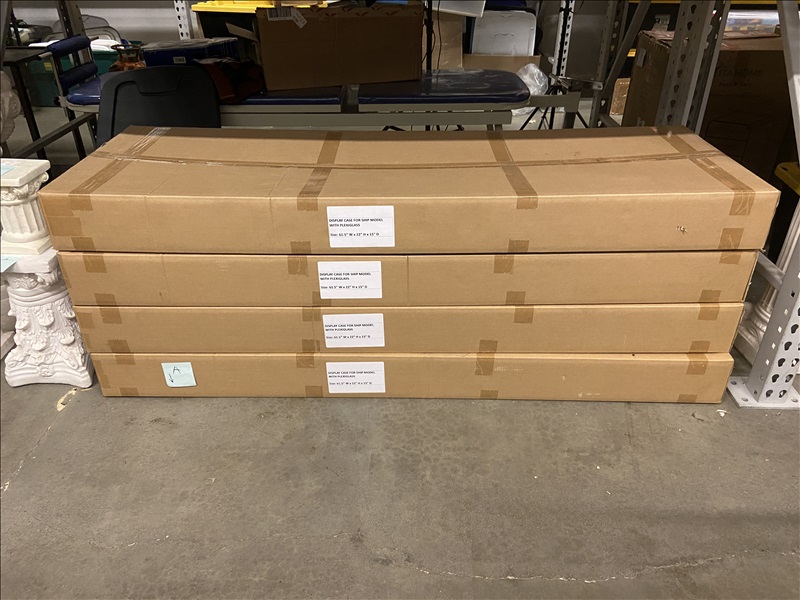 (4) 61.5" L X 15" W X 22" H WOOD FRAME SHIP MODEL DISPLAY CASES W/PLEXIGLASS SIDES (MODEL BOAT IN PHOTO NOT INCLUDED)