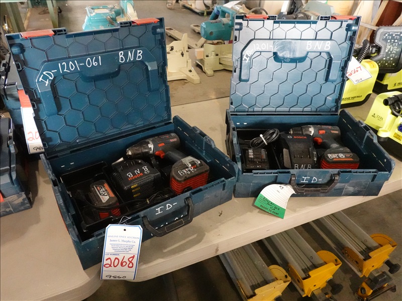 LOT, (2) BOSCH DDS182 1/2" CORDLESS DRILLS, 18V W/(4) BATTERIES, (2) CHARGERS & (2) INTERLOCKING STACKABLE HARD CASES
