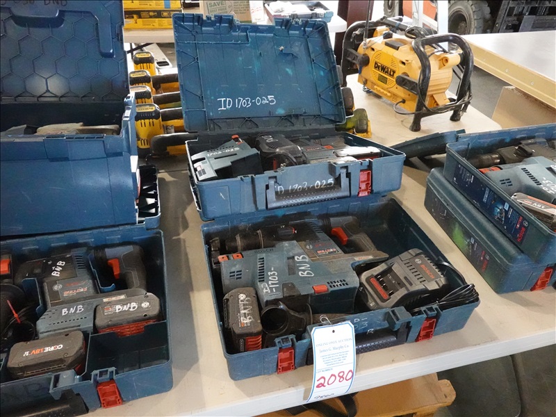 LOT, (2) BOSCH BULLDOG GBH18V-26 ROTARY HAMMER W/HEPA FILTER VAC ATTACHMENT, (3) BATTERIES, (2) CHARGERS & (2) HARD CASES
