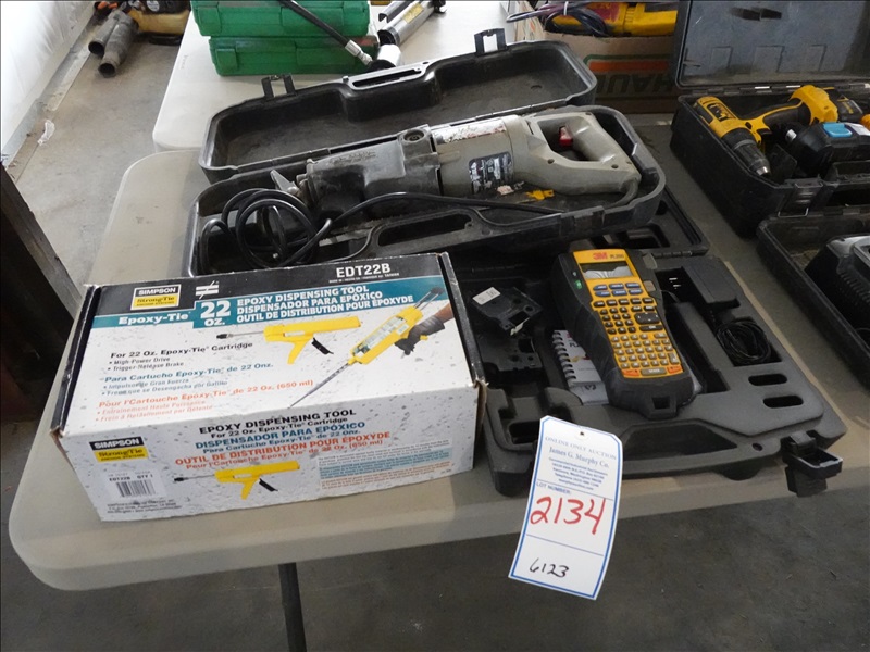 LOT, ASSORTED CONTRACTORS TOOLS TO INCLUDE: EPOXY DISPENSING TOOL, RECIPROCATING SAW & 3M PL200 PORTABLE LABELER