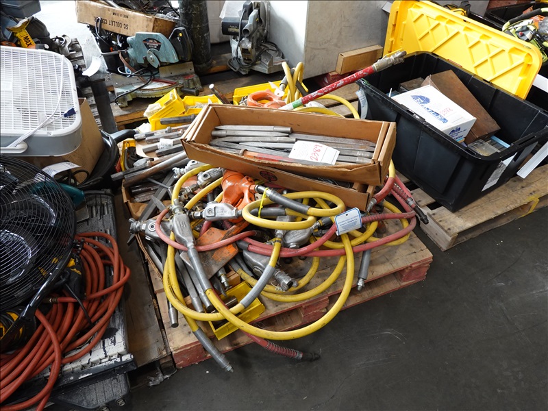 LOT, ASSORTED CHIPPING GUNS, BITS & AIR HOSES ON THIS PALLET