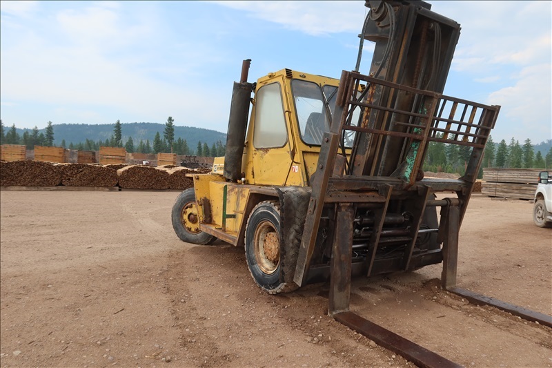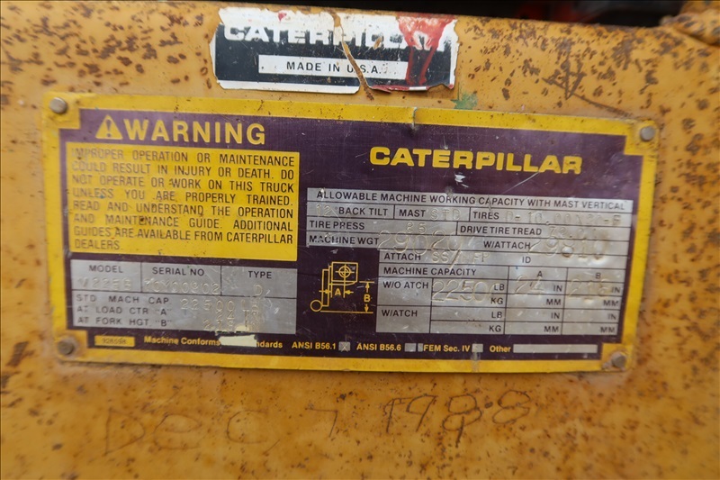 22,500 LB DUAL PNEUMATIC FORKLIFT, 218" 2-STAGE MAST, SIDE SHIFT, FORK POSITIONERS, CAT3208 (NEEDS WORK, UNIT #70)