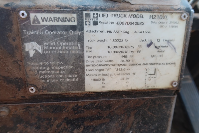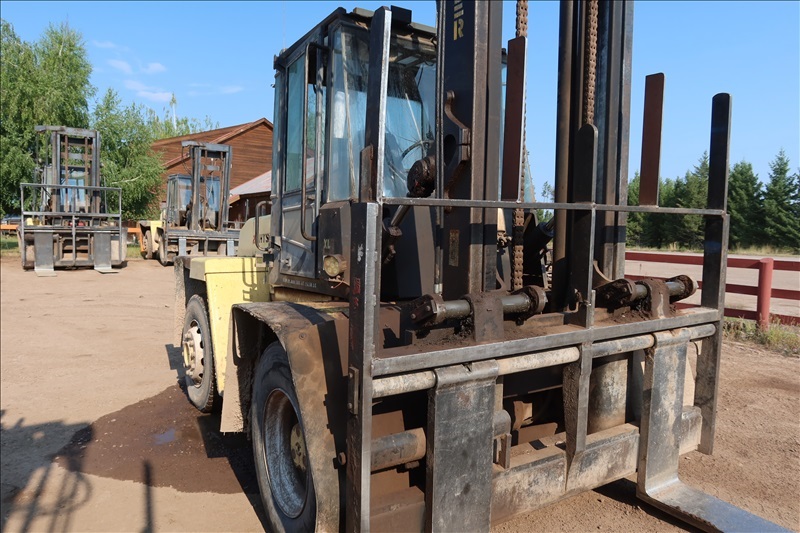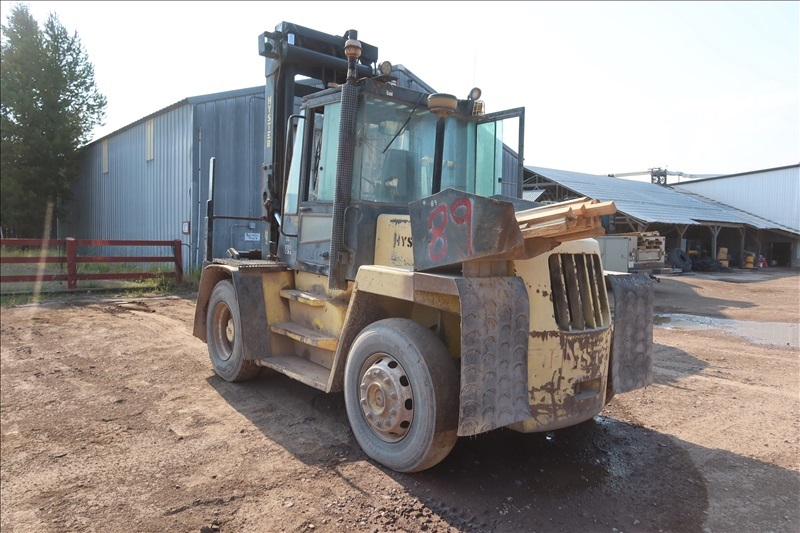 19,000 LB DUAL PNEUMATIC FORKLIFT, 212" MAST, SIDE SHIFT, LUMBER FORKS, PERKINS DIESEL, MONOTROL, ENCLOSED CAB (UNIT #85)