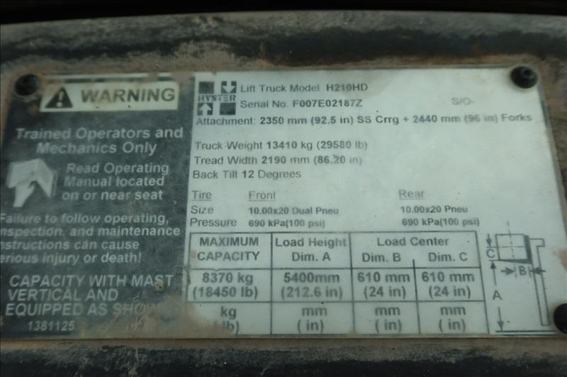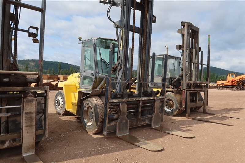 18,450 LB DUAL PNEUMATIC FORKLIFT, 212" 2-STAGE MAST, SIDE SHIFT, DUAL FORK POSITIONERS, LUMBER FORKS, FINGER TIP CONTROLS, 6 CYL DIESEL, MONOTROL, ENCLOSED CAB (UNIT #119)