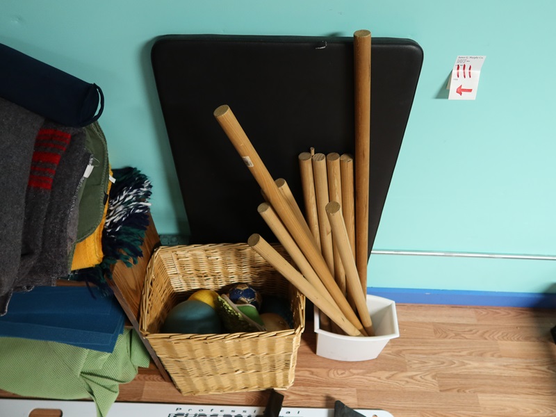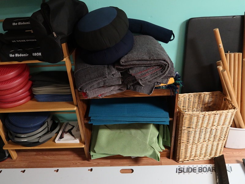ASSORTED YOGA EQUIPMENT/ACCESSORIES & MISC WORKOUT EQUIPMENT (DOES NOT INCLUDE LARGE WOOD CABINET)