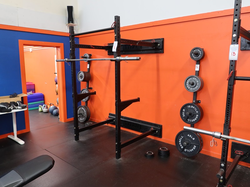 WALL-MOUNTED FOLDING RACK, 41" DEPTH/91" HEIGHT W/WEIGHT BAR (UNIT IS BOLTED TO WALL, BUYER IS RESPONSIBLE FOR TOOLS & REMOVAL)