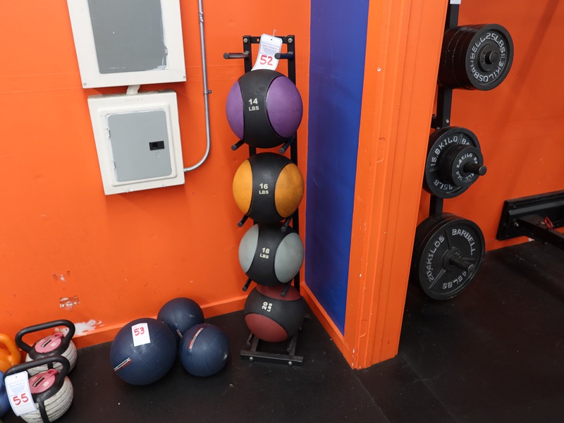 (4) TITAN MEDICINE BALLS TO INCLUDE: 14 LB, 16 LB, 18 LB & 20 LB W/BALL RACK
