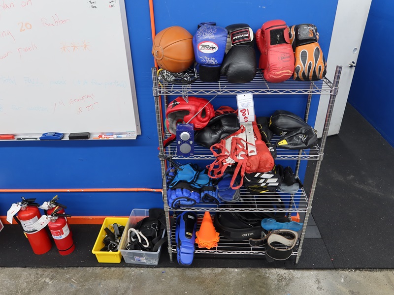 ASSORTED BOXING GLOVES, WEIGHT BELTS, WEIGHTED BELTS, BOXING MASKS & ASSORTED WORKOUT EQUIPMENT