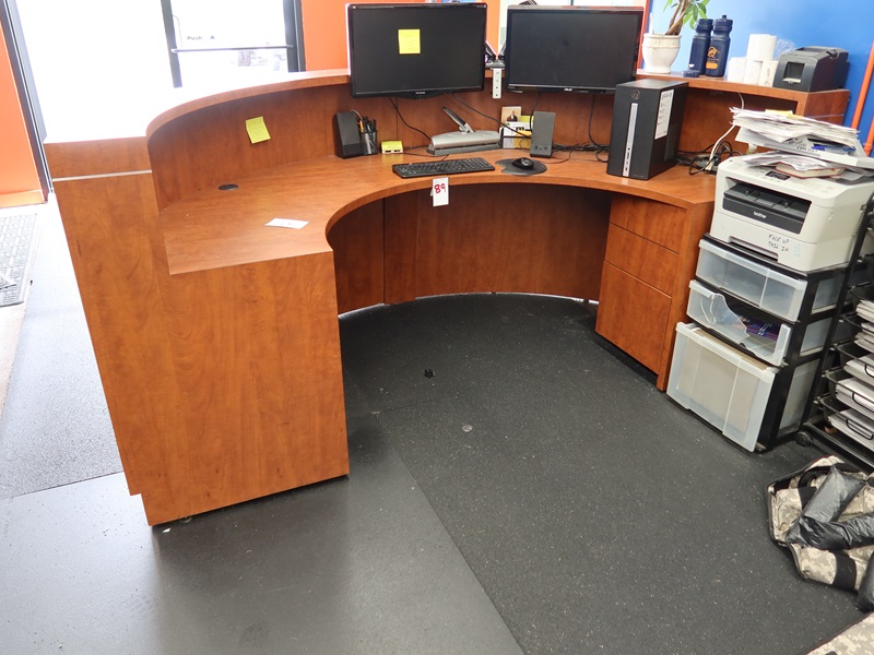 8' U-SHAPED RECEPTION DESK W/PADDED CHAIR ON CASTERS (DOES NOT INCLUDE MONITORS, CPU, PRINTER OR CONTENTS)