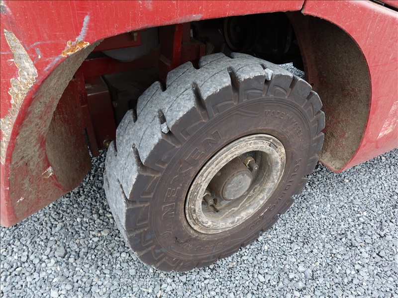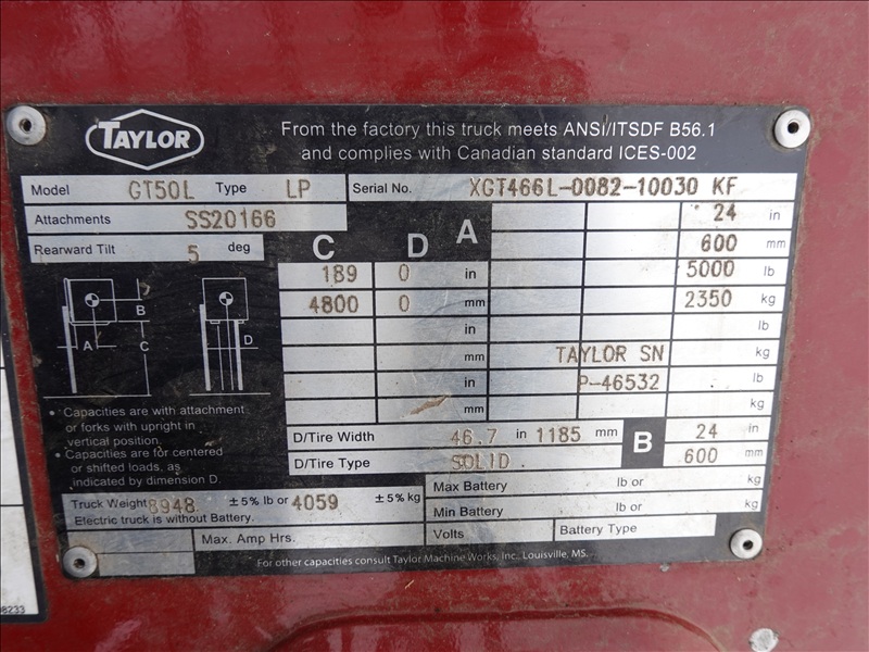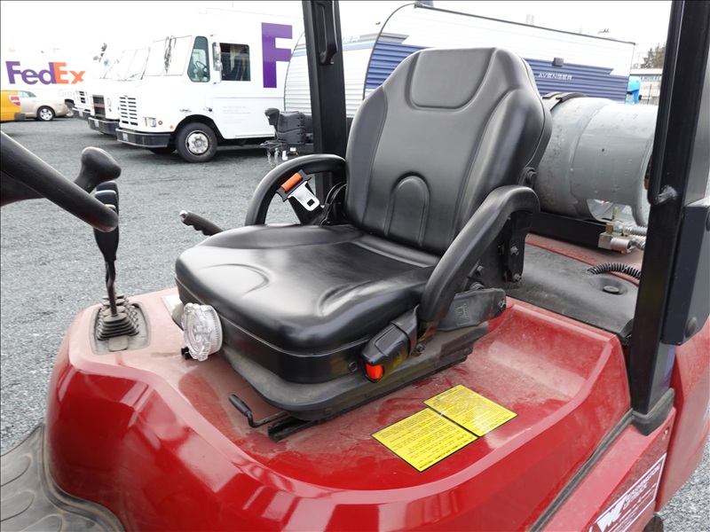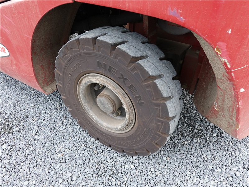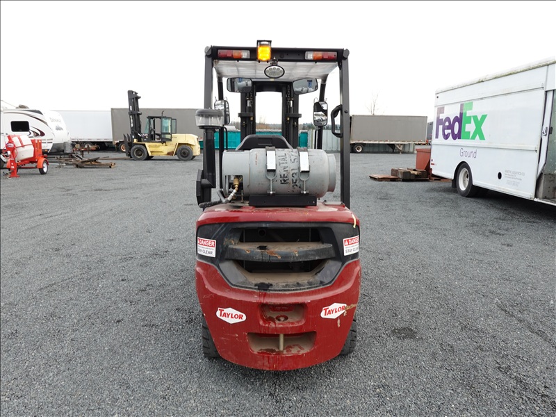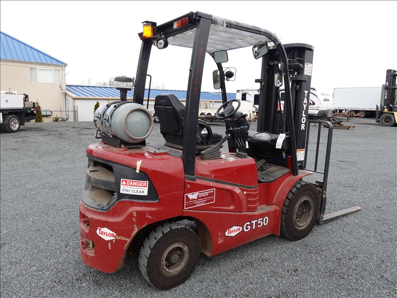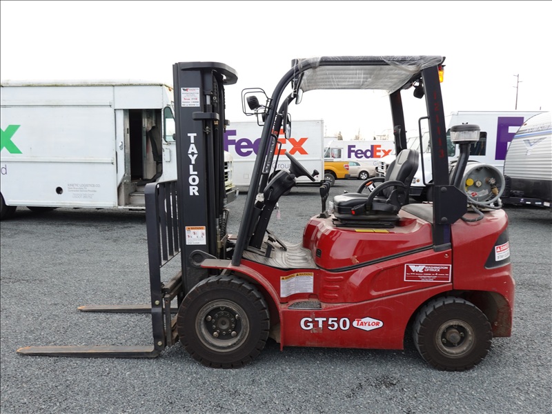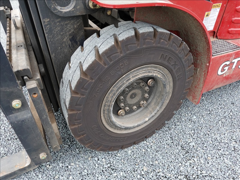 5,000 LB SOLID TIRE FORKLIFT, 189" FORK HEIGHT, 3-STAGE MAST, SIDE SHIFT, 4 CYL LPG