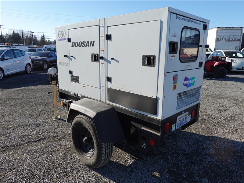 S/A, 48 KVA TRAILER MOUNTED GENERATOR, DOOSAN 4 CYL DIESEL ENGINE, 120/208/240/480V, SINGLE OR 3 PHASE, ELECT BRAKES, 225/75R15, HOUR METER READS: 3M337