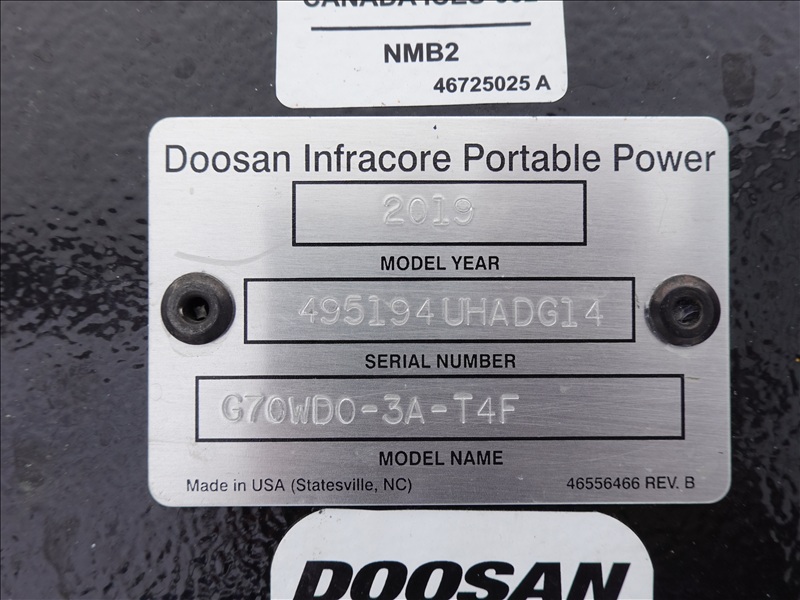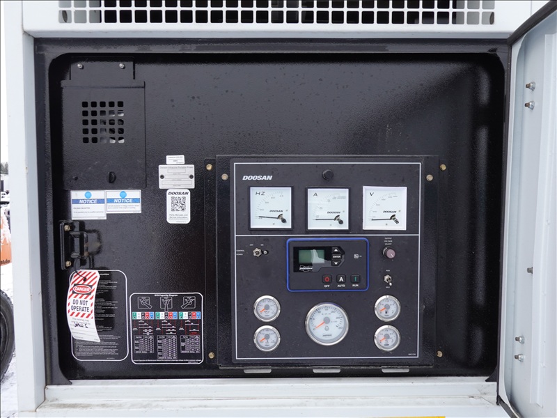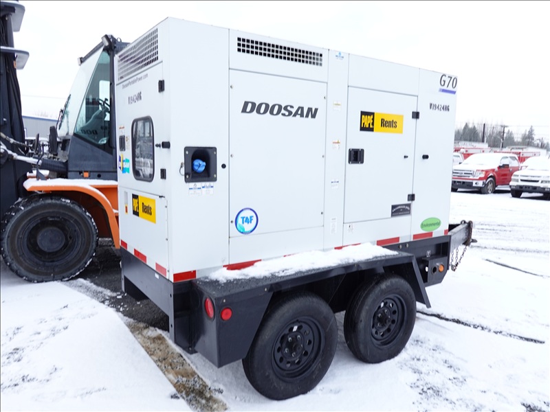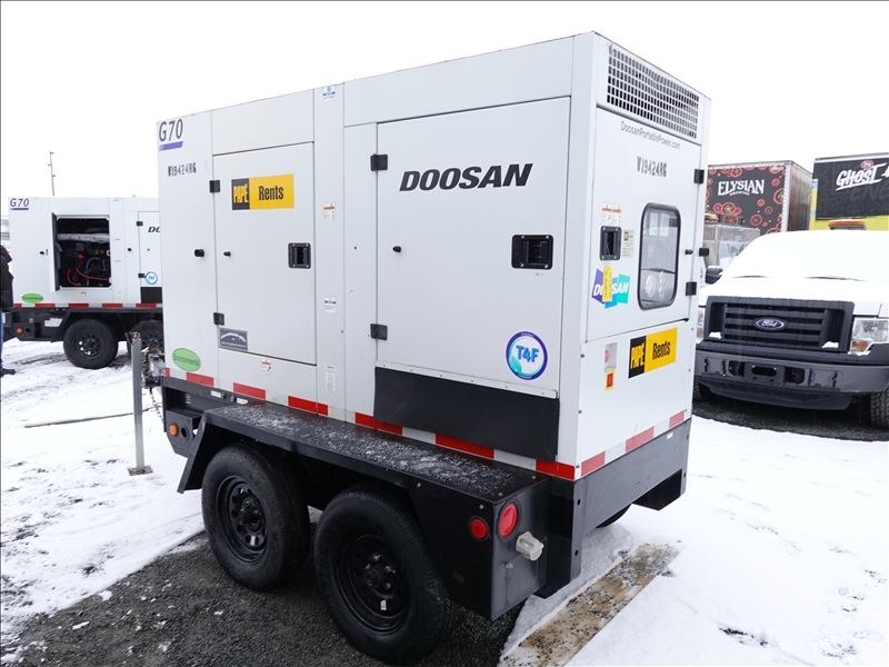 T/A, 70 KVA TRAILER MOUNTED GENERATOR, DOOSAY 4 CYL DIESEL, 120/208/240/480V, SINGLE OR 3 PHASE, ELECT BRAKES, HOUR METER READS: 4,019