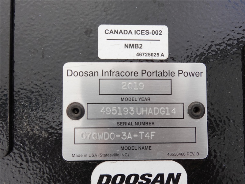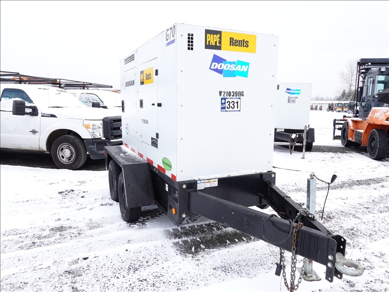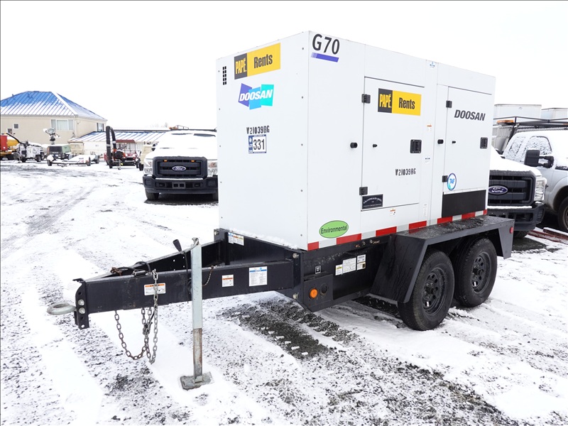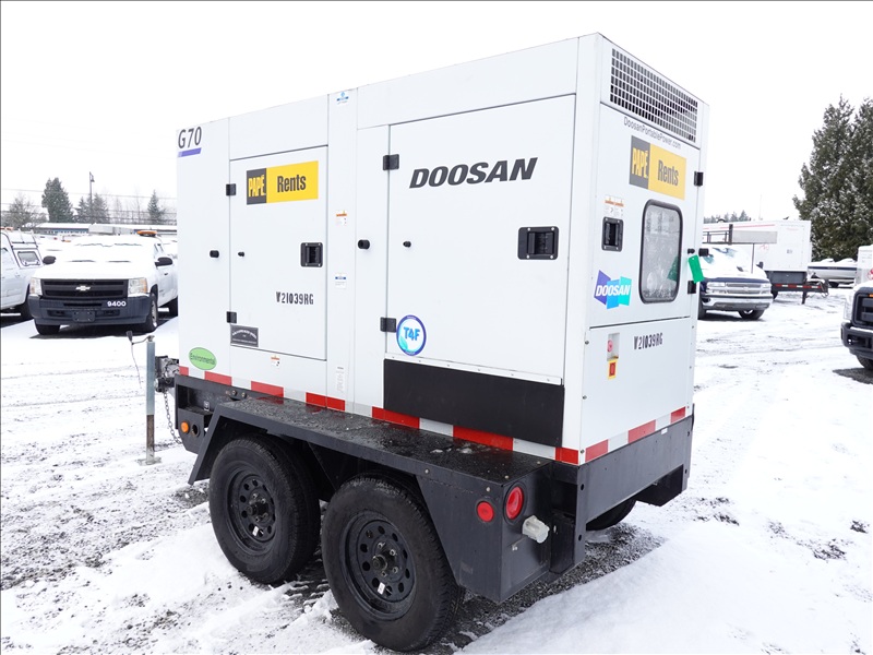 T/A, 70 KVA TRAILER MOUNTED GENERATOR, DOOSAY 4 CYL DIESEL, 120/208/240/480V, SINGLE OR 3 PHASE, ELECT BRAKES, HOUR METER READS: 7,701