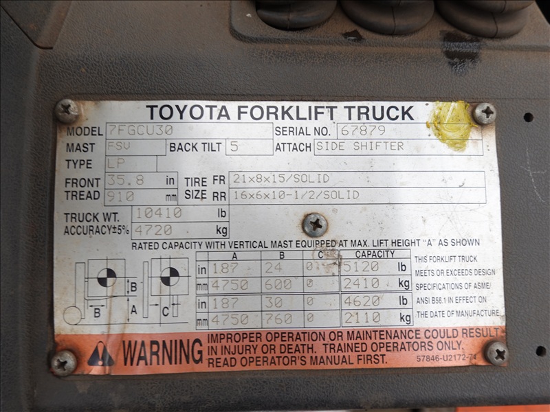 5,120 LB HRT FORKLIFT, 187" FORK HEIGHT, 3-STAGE MAST, SIDESHIFT, 4 CYL LPG, HOUR METER READS: 5,365