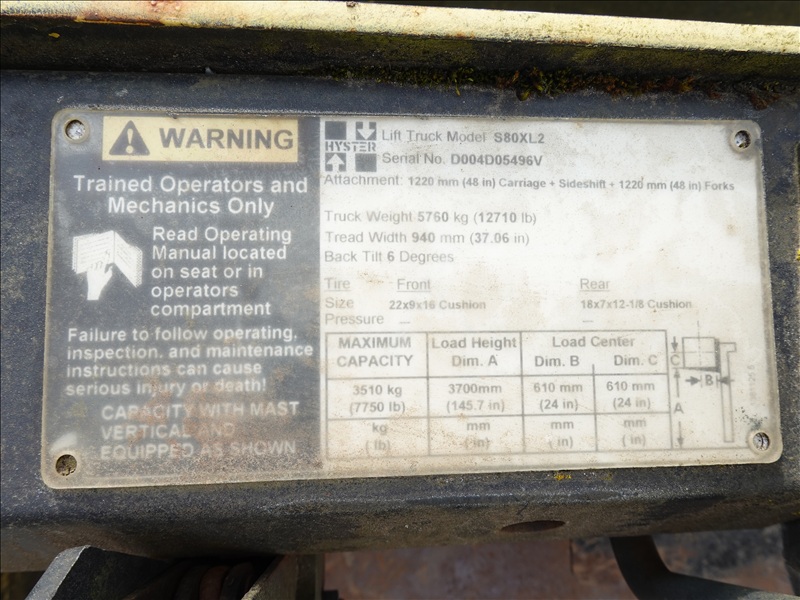 7750 HRT FORKLIFT, 145" FORK HEIGHT, 2-STAGE MAST, SIDE SHIFT, 6 CYL LPG, HOUR METER READS: 8,378