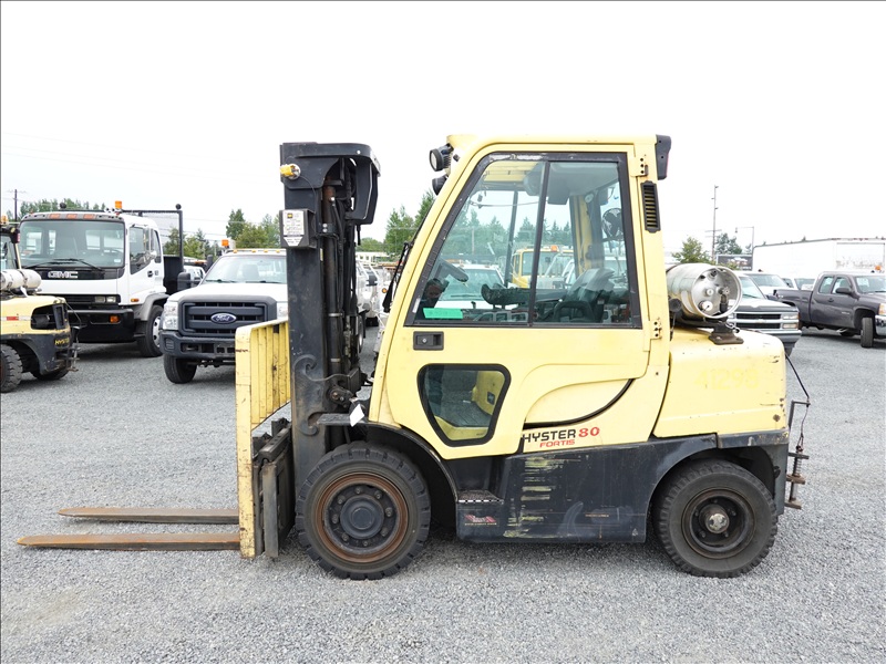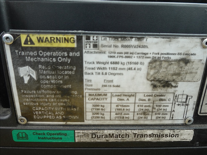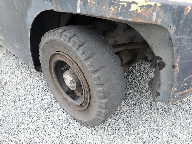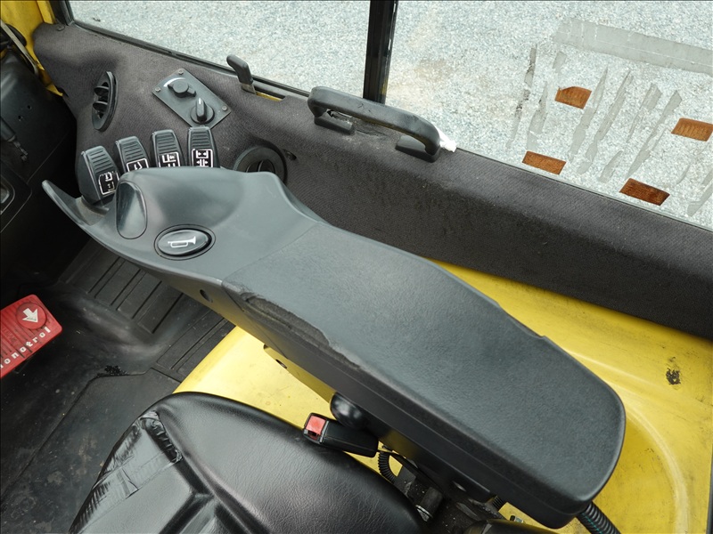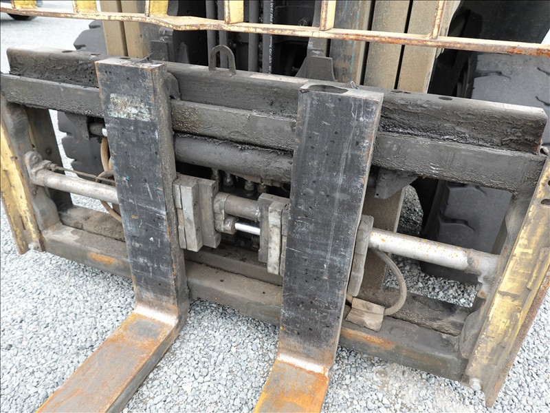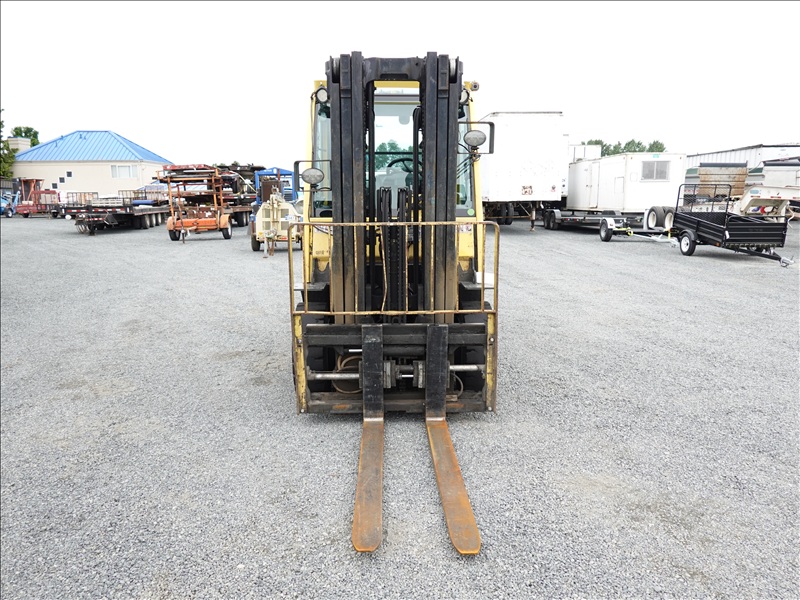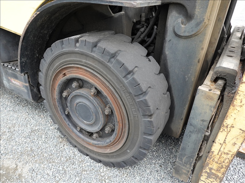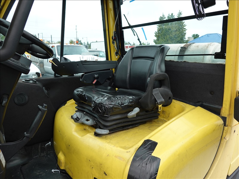 7,150 LB SOLID TIRE FORKLIFT, 185.6" FORK HEIGHT, 3-STAGE MAST, SIDE SHIFT, FORK POSITIONED, FTC, 6 CYL LPG, CAB, TOW HITCH (UNABLE TO READ HOUR METER, SEE PHOTO)